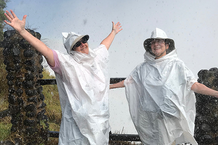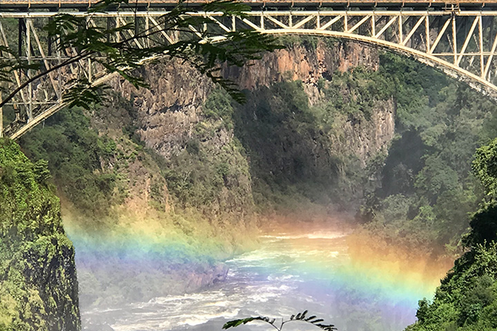 It was the end of the rainy season, so the falls were big, full, powerful. I had no idea how massive it would be. Robert told us we’d get wet, but we had no idea just how wet. We started on the Zambia side and followed the trails, stopping at viewpoints along the way. The closer we got, the more water sprayed us. There were several rainbows across the falls right in front of us. We crossed a narrow bridge over the water and were in a torrential downpour of spray coming off the falls. It was hard to see, the wind was blowing, we were soaked…and we were all laughing! What an amazing experience!