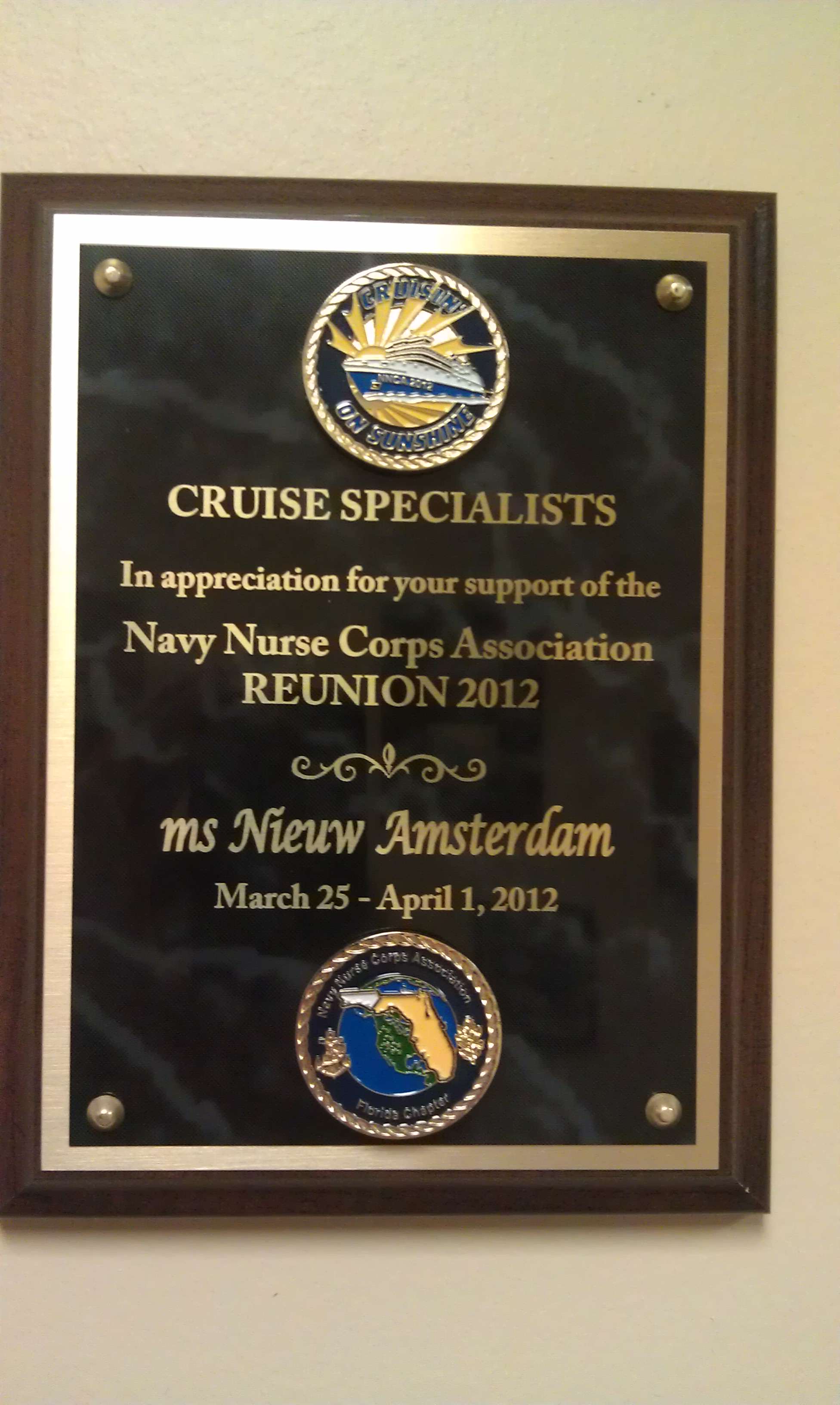 Navy Nurse Corps Association Thanks Cruise Specialists with a Special Plaque Cruise Specialists has been planning reunion cruise trips for the NNCA (Navy Nurse Corps Association) since 2002. The Cruise Specialists team organized and escorted the NNCA … [Read more...]