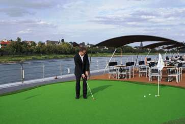 Entertainment onboard is a minimum, one evening a pianist performed. Another night they had a DJ with dancing. The Panorama Lounge is the main gathering space for evening cocktails and socializing. There is a small onboard spa with a small workout area and spa treatments such as massages. The top Sun Deck was a terrific spot to sit or lounge and we loved the little putting green. There was a very small hot tub on the back, but I only saw one or two people ever take advantage of it.
