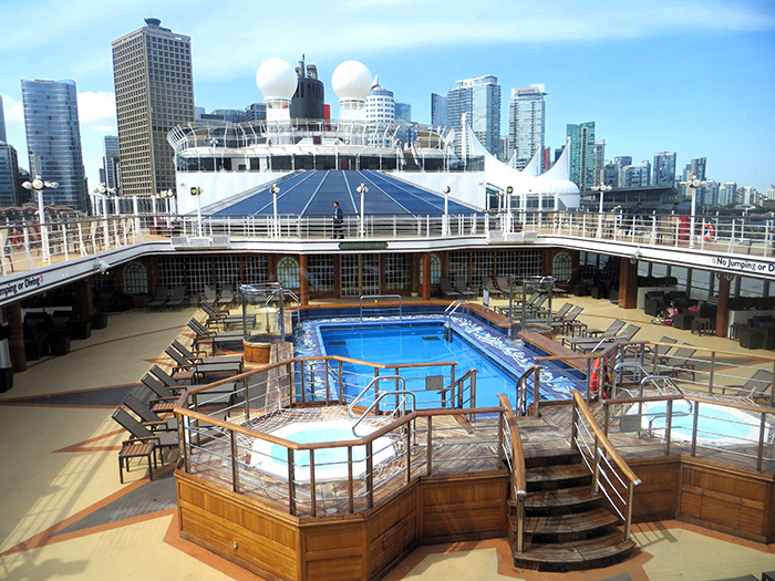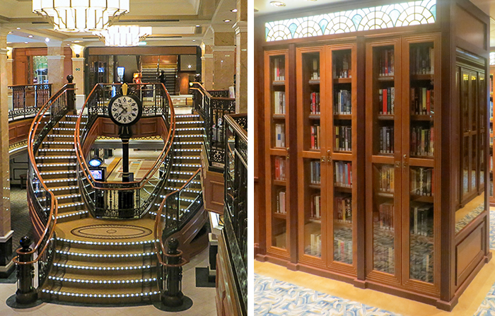 Public Spaces: The Queen Elizabeth‘s public spaces are some of the most beautiful and welcoming areas on the ship. From the double staircase in the multi-level Grand Lobby to the Royal Court Theatre, with its private box seating areas (where champagne and treats are served to those who book for a nominal extra charge), to the stunning Queens Room with glittering chandeliers and large dance floor, every corner of the ship is designed to delight the senses. The architecture and design are a tribute to the golden age of ocean liners, with a rich blend of Art Deco and modern elements. Guests can relax and unwind in the many lounges and bars, browse the shops, or enjoy a book in the two-story library that is very well-stocked with around 6,000 items! If you’re seeking more activity, take a dip in one of the pools on deck, join others for some fun on the Games Deck, or visit the well-equipped Fitness Centre for a workout with a view. Entertainment options include lectures, cooking demonstrations, live music and dancing in the Queens Room or Yacht Club, performances in the Royal Court Theatre, or trying your luck in the Casino.