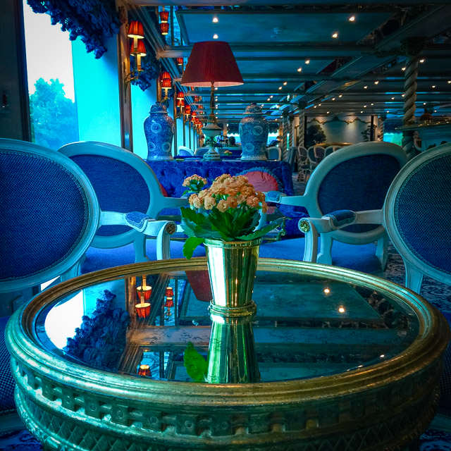 Step across the “threshold” onto the balcony, and you’ll find an elegant table complemented by two antique chairs, with white frames and blue upholstery.