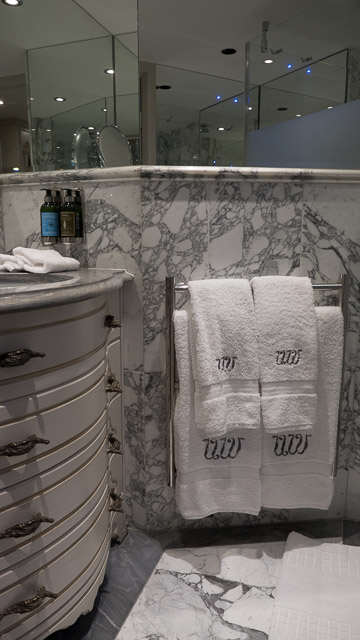 The stateroom’s marble bathroom has a large shower and single sink with L’Occitane en Provence products, lighted magnifying mirror, hair dryer, thick towels and soft robes. There’s plenty of storage, so don’t be shy about bringing along your entire toiletry kit.