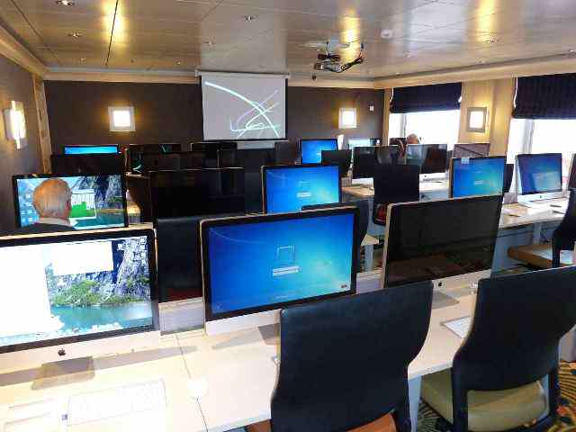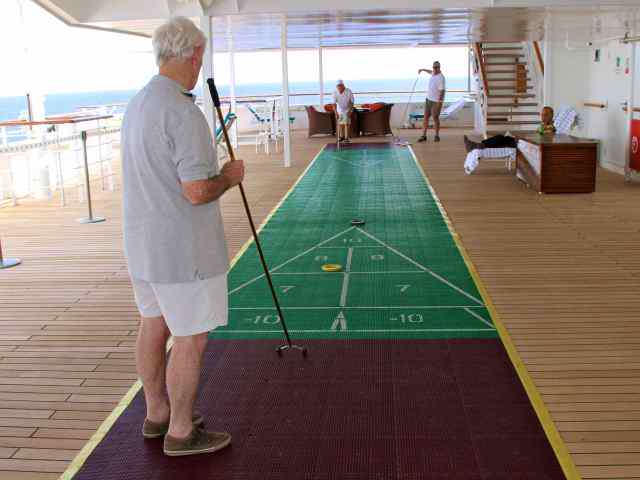Buddy and I begin our day with 8:00am yoga followed by breakfast, a 10:00am lecture, Cruise Specialists coffee hour at 11:00am, lunch, dance class, afternoon lecture, walking the deck and squeezing in other activities whenever we find time. Buddy enjoys the golf classes while I have attended art classes. I am a temporary art drop out as my beginner skills were surpassed when the master class began. Last year each segment offered different art media and instructors so I plan to challenge my artistic abilities again in a few weeks with something that doesn’t require a paint brush.